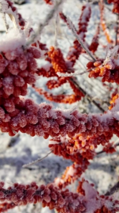 凌晨两点,气温已降至-18度。当工人们用木棍敲击树枝时,饱满的浆果就会掉下来。低温使水果凝结成天然冰晶,使其更容易收获,不易腐败,同时糖分也能很好地沉淀。沙棘的维生素C和黄酮类化合物含量达到顶峰,使每个果实都成为营养成分浓缩的“黄金果”。