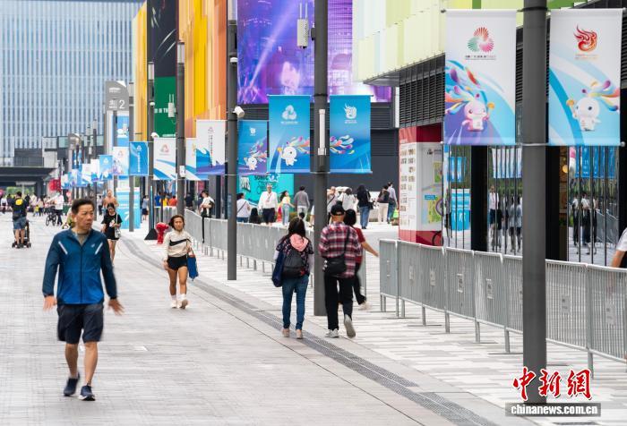 11月1日,香港新地标启德体育公园体育大道挂满了第十五届全国锦标赛(下称“第十五届全国锦标赛”)的宣传装饰元素,等待11月9日全国锦标赛正式开幕。图为11月2日举行的第十五届全运会香港区火炬接力活动沿体育大道悬挂的装饰宣传品。图片来源:中新社记者 侯宇
